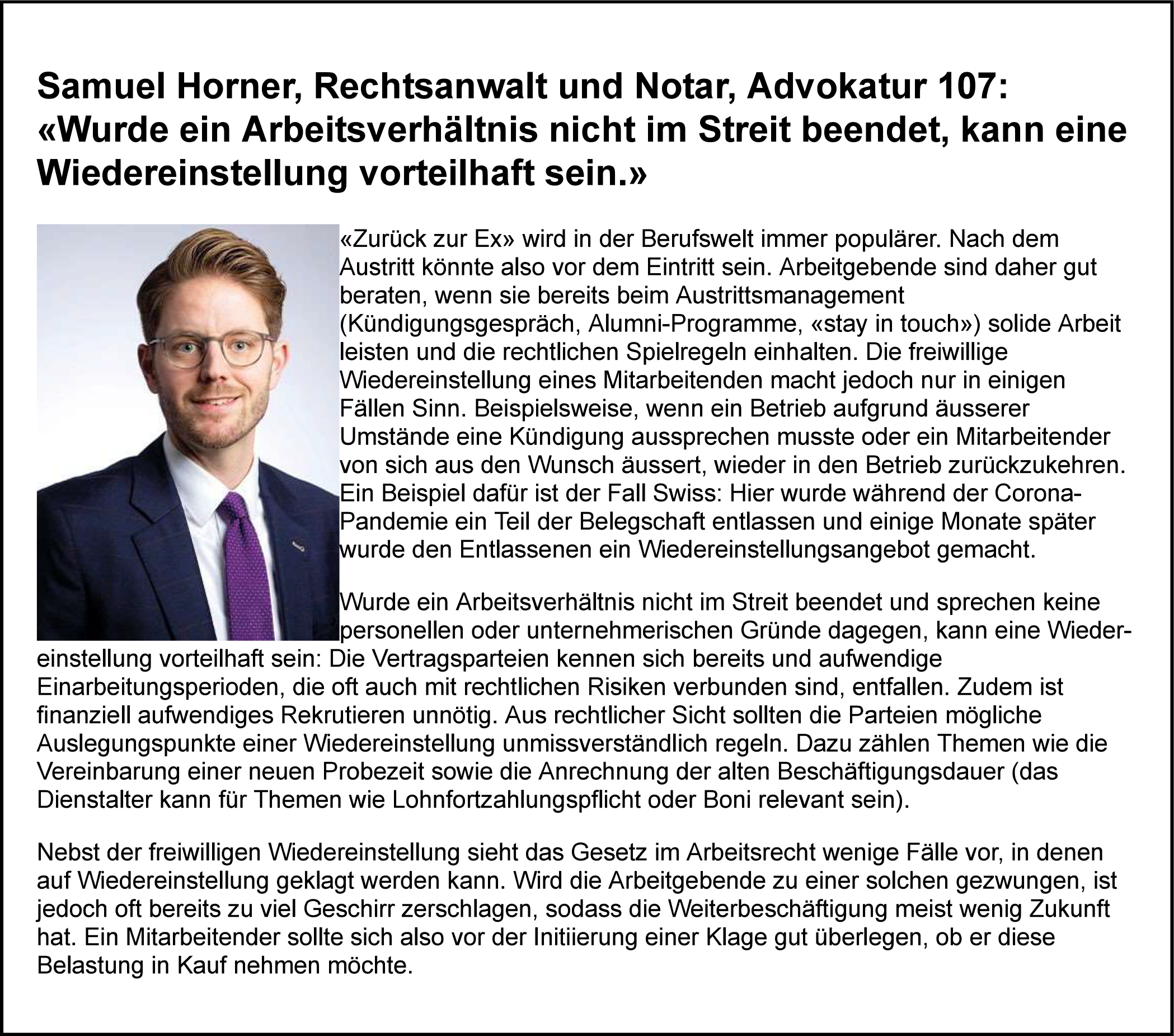 Zurück zur Ex in der Arbeitswelt? Aus arbeitsrechtlicher und unternehmerischer Sicht ist dieser Schritt eine Überlegung wert. Unter welchen Umständen dies durchaus sinnvoll sein kann, erfahren Sie im Beitrag von RA Samuel Horner.